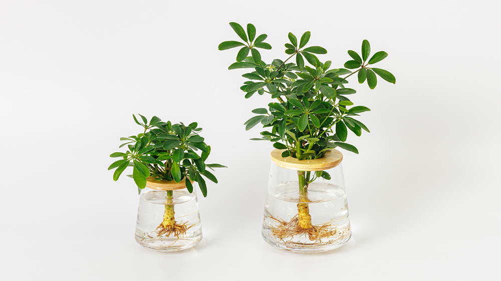 シェフレラを水耕栽培用の器に入れて、根が半分程度、浸かるくらいの水を入れます。