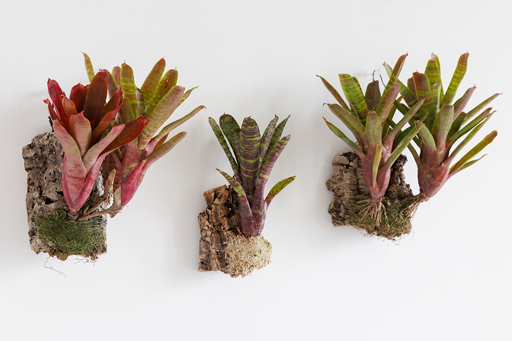 ブロメリアはパイナップル科の植物で、色鮮やかな葉と独特の姿が室内を華やかに彩ります。着生植物としての性質を持ち、土がなくても育つため水耕栽培に非常に適しています。葉の中心部分に水を溜める「タンク」と呼ばれる構造があり、ここに水を注ぐだけで管理できる手軽さが初心者向きです。土栽培では排水性の高い特殊な土が必要ですが、コルクに水苔で着生させたブロメリアならそうした準備が不要で始めやすくなります。明るい室内を好み、適切な環境では美しい花を咲かせることもあります。エキゾチックな雰囲気が室内空間のアクセントとなり、個性的なインテリアを目指す方におすすめです。