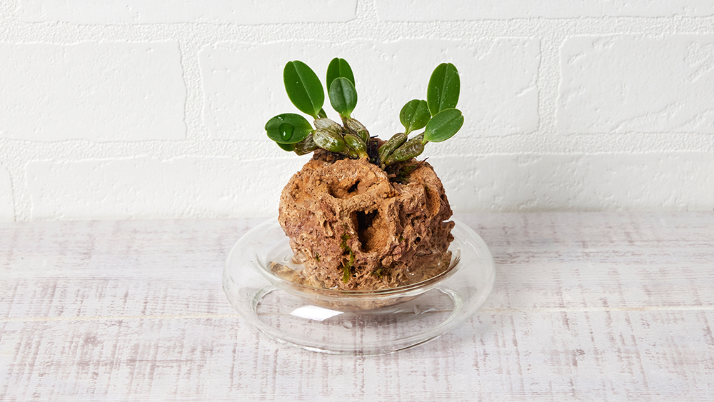 WOOTANGで販売されている「デンドロビウム ジェンキンシー」は、水を吸い上げる特殊な石の上にデンドロビウムが植えられており、その石をガラスの受け皿に乗せて育てるスタイルです。インテリア性に優れたデザインで、リビングや玄関など、お部屋のどこに置いても洗練された雰囲気を演出できます。