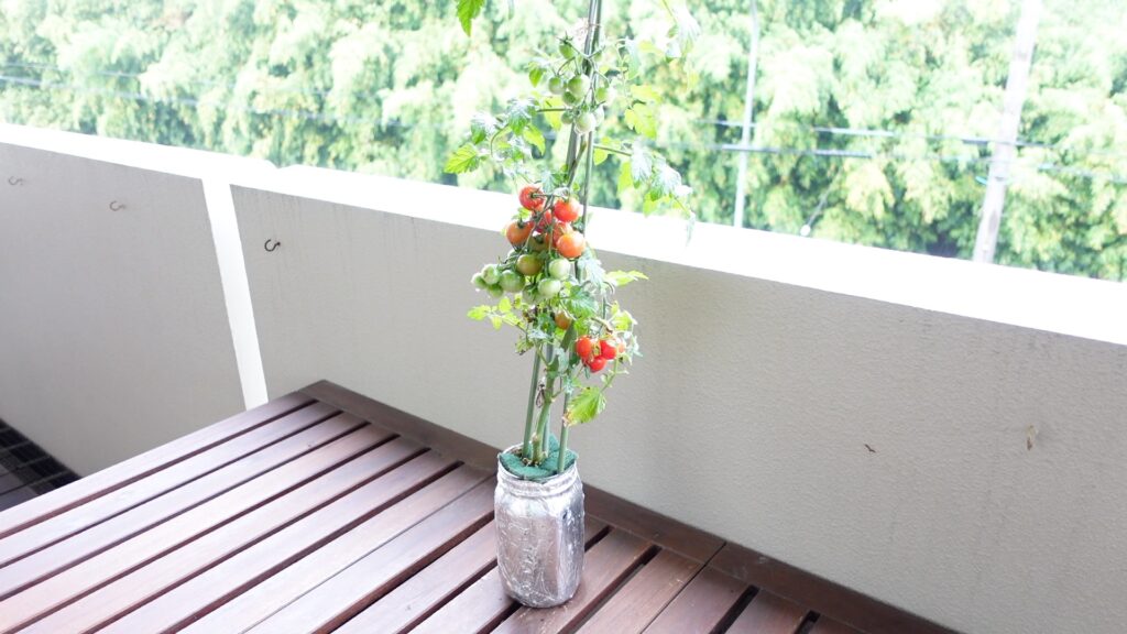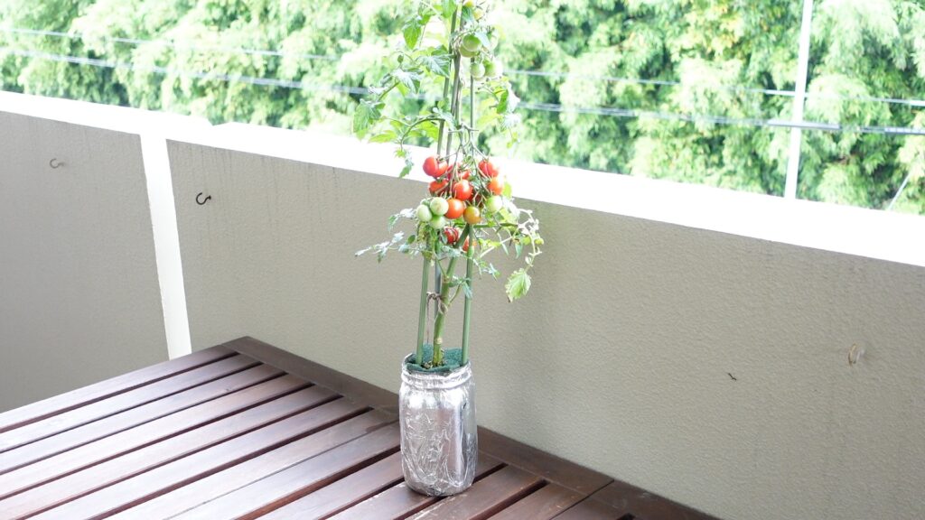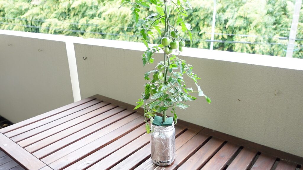 アルミホイルを巻いたら、いよいよ栽培スタートです。まず置き場所ですが、ミニトマトは日光を非常に好む植物(陽性植物)で、1日6時間以上の直射日光が理想的です。南向きのベランダや庭など、日当たりの良い屋外が最適な環境です。