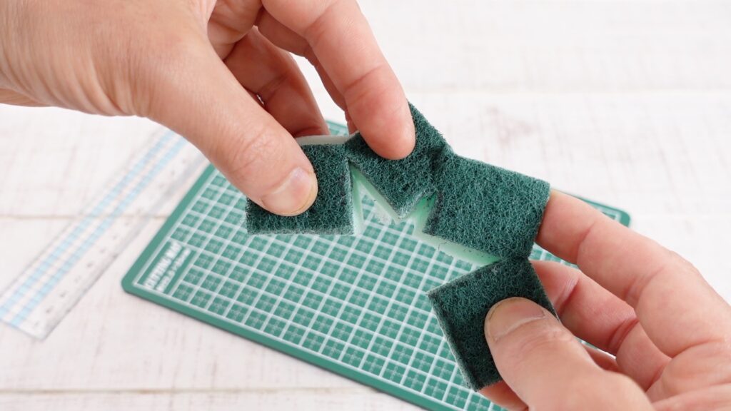 まず2層構造のキッチン用スポンジを、容器の口の大きさにぴったり合うようにカッターで切ります。大きすぎると容器に入らず、小さすぎると隙間から落ちてしまうため、容器の口に当てながら少しずつ微調整してください。