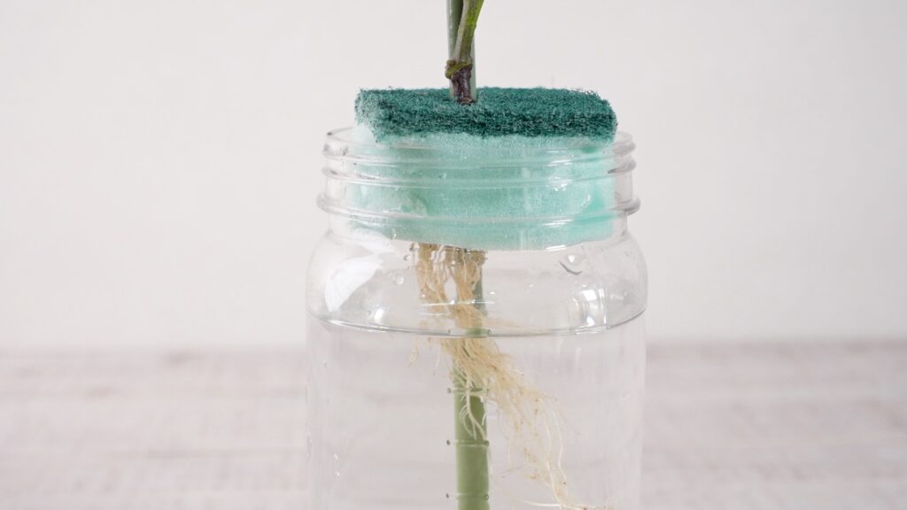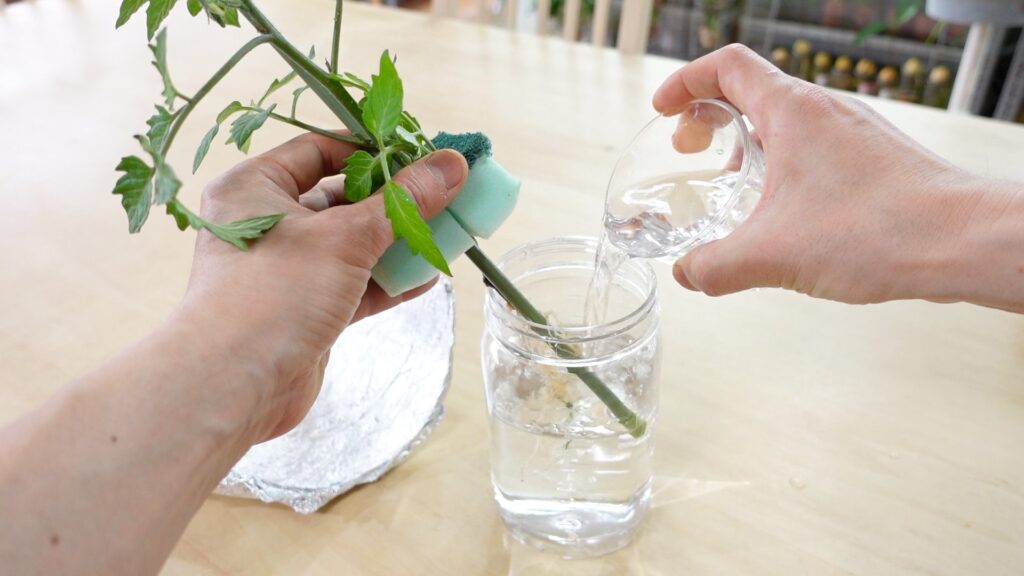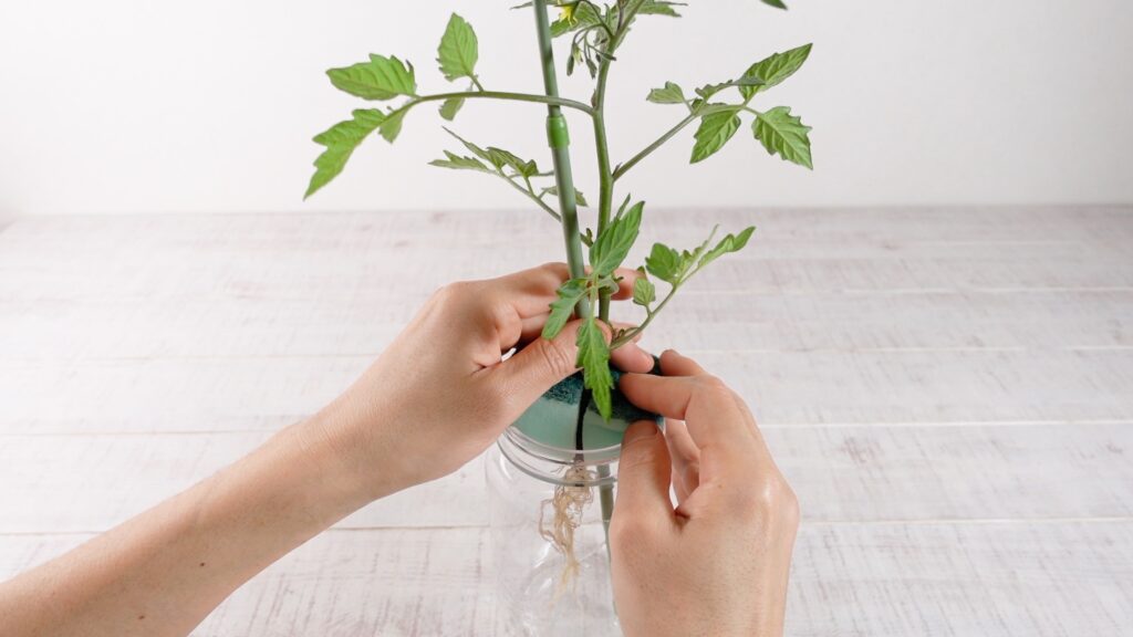 苗を挟んだスポンジを容器の口にセットします。2層スポンジの硬い研磨材層が容器の口縁に引っかかり、スポンジが自然に宙吊りになります。この仕組みのおかげで、根は養液の中に浸かりながらも、茎付近のスポンジ部分は空気に触れる状態を保てます。根への酸素供給と栄養吸収を同時に実現できる、シンプルながら理にかなった構造です。