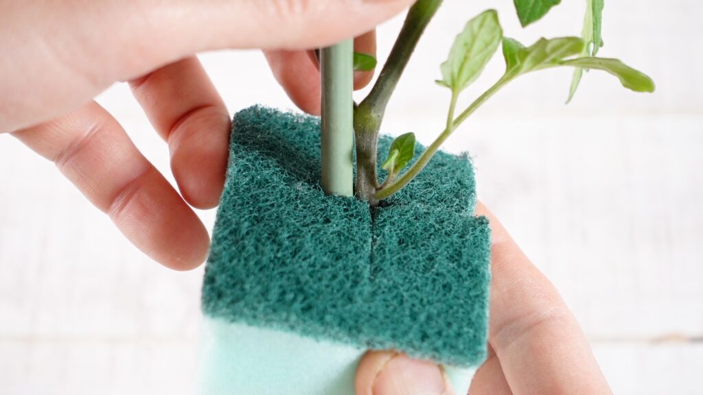 挟む際は、茎と根の境目(土際の部分)が十字の中心にくるよう位置を合わせることが大切です。この位置が正しくないと、根が養液に届かなかったり、茎が水に浸かって傷んだりすることがあります。支柱をこのタイミングでスポンジに一緒に挟み込んでおくと、後から追加する手間が省けます。