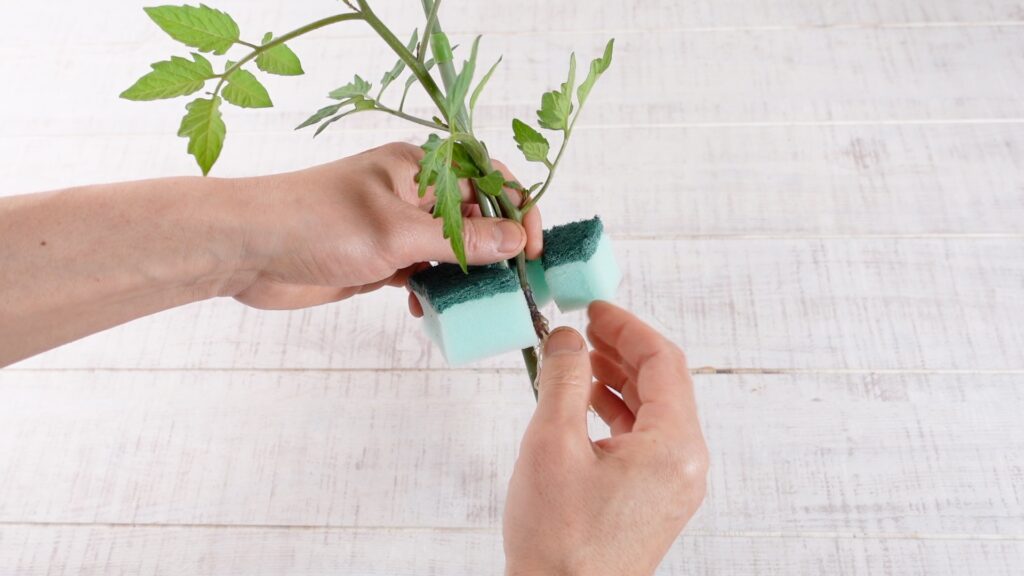 土を完全に落としたミニトマトの苗と支柱を、スポンジの切り口に一緒に挟み込みます。
