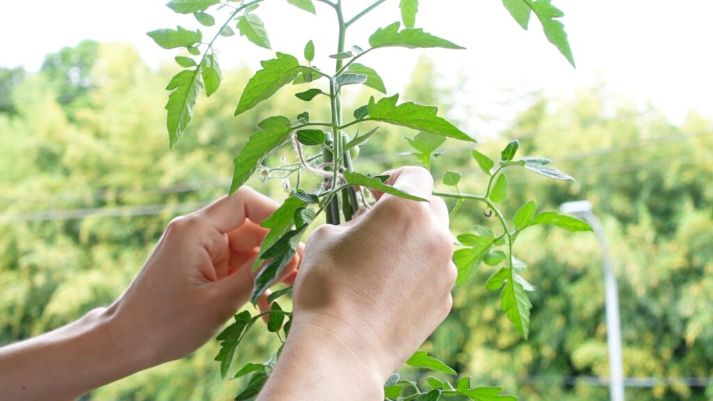 茎と支柱を固定するひもは、締めすぎると茎が傷つくため、8の字に結んで茎とひもの間に少しゆとりを持たせる「8の字結び」がおすすめです。ミニトマトは成長すると1m以上になることもあるため、支柱は長めのものを選んでおくと安心です。