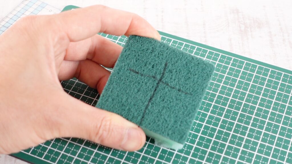 スポンジのサイズが決まったら、ペンでスポンジの表面に十字の線を描きます。このとき、片方の線はスポンジの端から端まで貫通させ、もう片方の線は中心で止めます。この「一方だけ端まで伸ばす」という点が重要なポイントです。