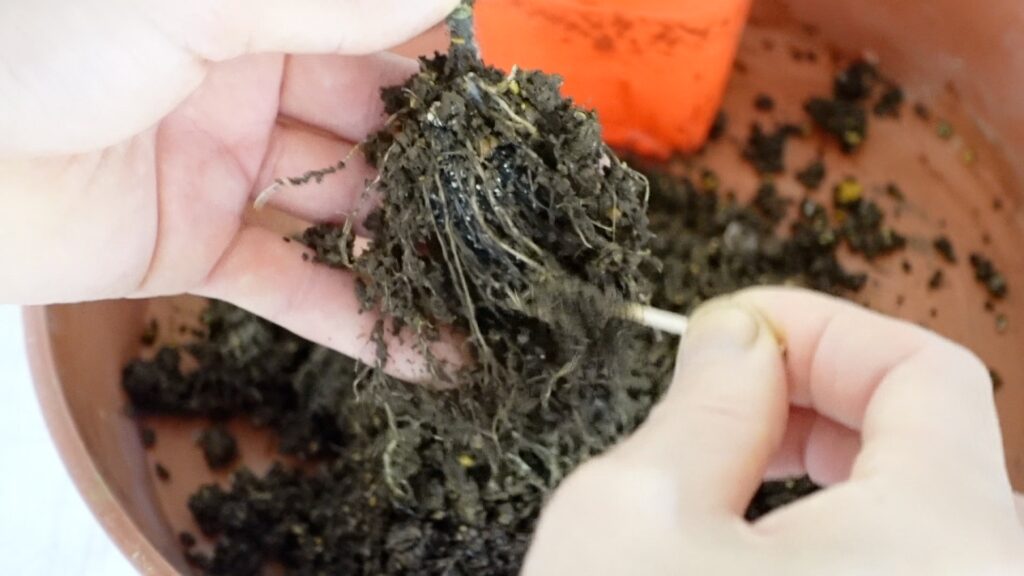 次に楊枝や細い棒を使って、根の隙間に入り込んだ細かい土粒を丁寧にほぐしながら落とします。一度に無理に落とそうとすると根が切れてしまうので、少しずつ根をほぐしながら作業するのがコツです。