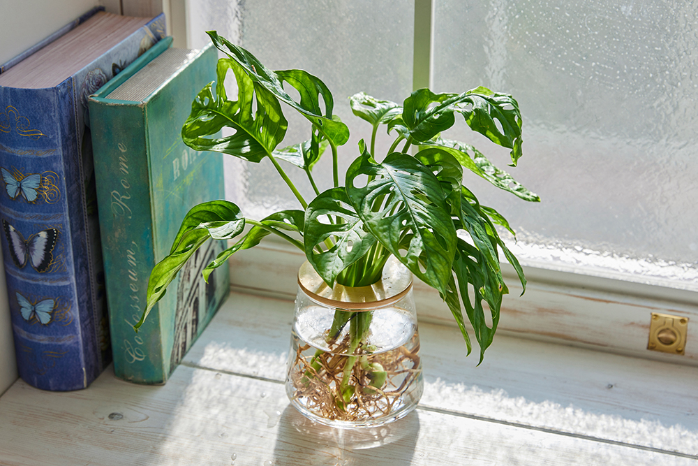 葉に窓のような美しい穴が開くことから「マドカズラ(窓葛)」と名付けられた、モンステラの仲間。小ぶりながらも存在感があり、デスクや棚の上にちょこんと飾るのに最適。水耕栽培との相性も良く、透明な容器との組み合わせがおしゃれです。
