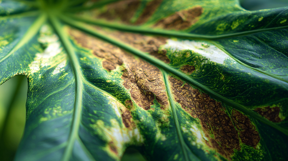 - 葉の表面に白っぽい・茶色いシミが広がる