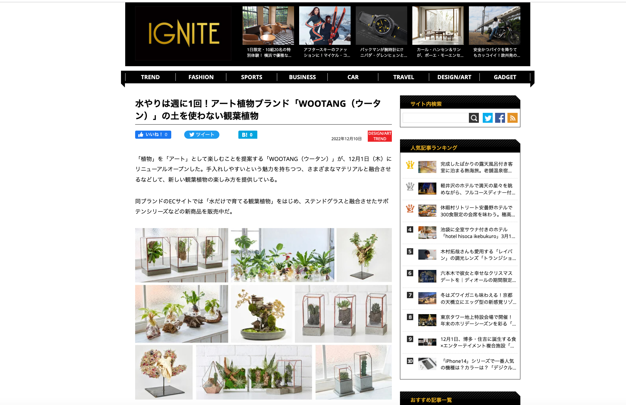 大人の上質な暮らしを提案する男性向けライフスタイルマガジン「IGNITE」、女性向けWEBメディア「Pouch【ポーチ】」でWOOTANGが紹介されました。
